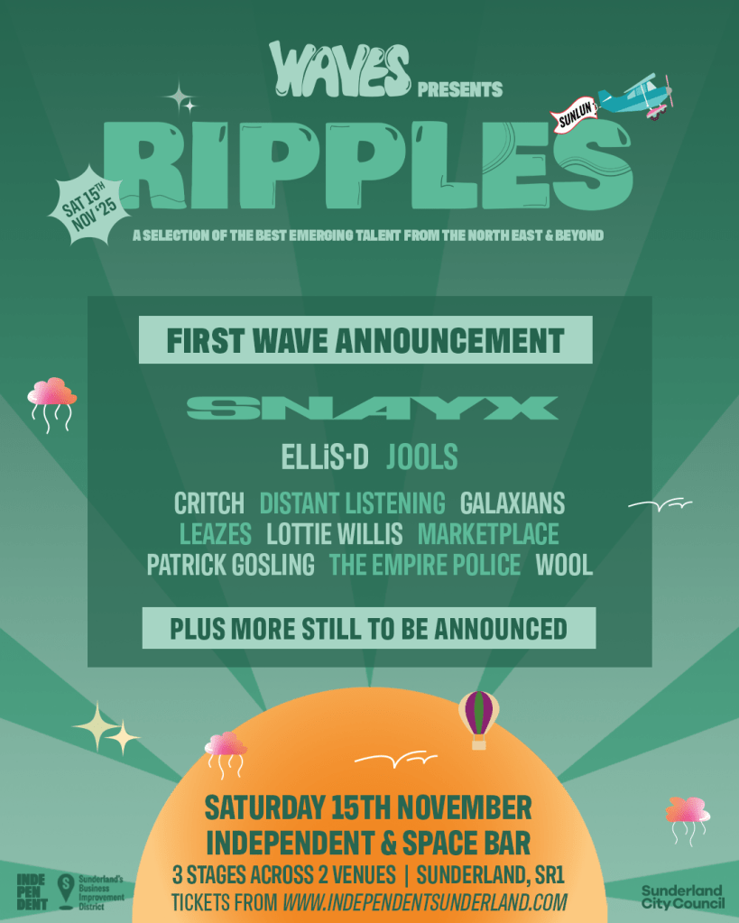 On Ripples, the festival organisers said: “Ripples is about keeping the spirit of Waves alive and continuing to give a platform to incredible artists from the North East and beyond. We’re buzzing to share this first line-up and to bring a packed day of live music back to Sunderland this November.” Ripples will feature three stages across two of Sunderland’s grassroots music venues – Independent and Space Bar – offering a full day of performances from emerging and established artists from across the UK. Tickets are available here!